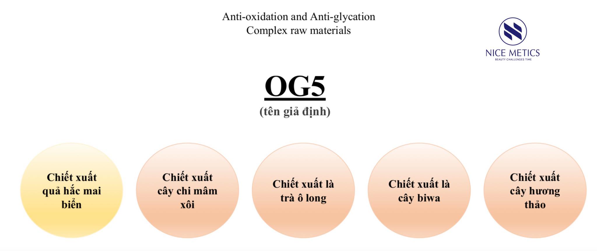 OG5 là một hợp chất được chiết xuất từ 5 loại thảo dược quý hiếm: quả hắc mai biển, cây chi mâm xôi, lá trà ô long, lá cây biwa, cây hương thảo. (OG5 là viết tắt của cụm từ 5 Anti-Oxidation and Anti-Glycation ingredients)