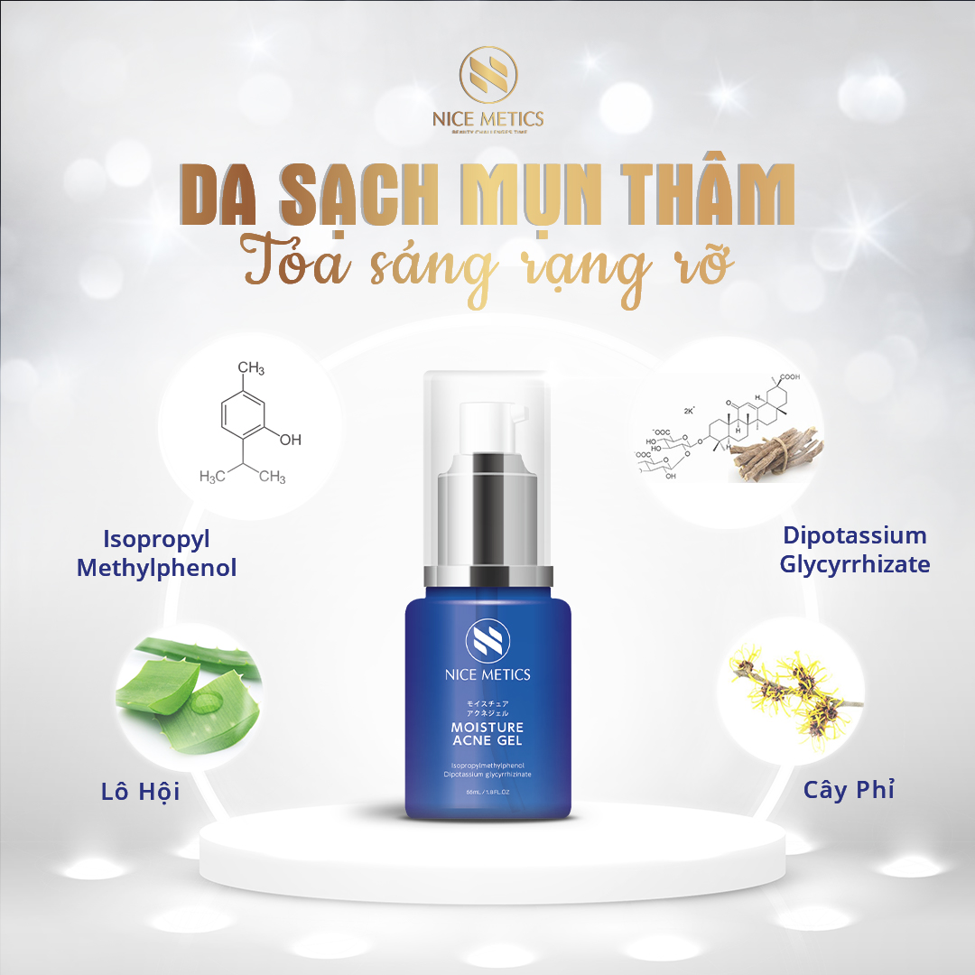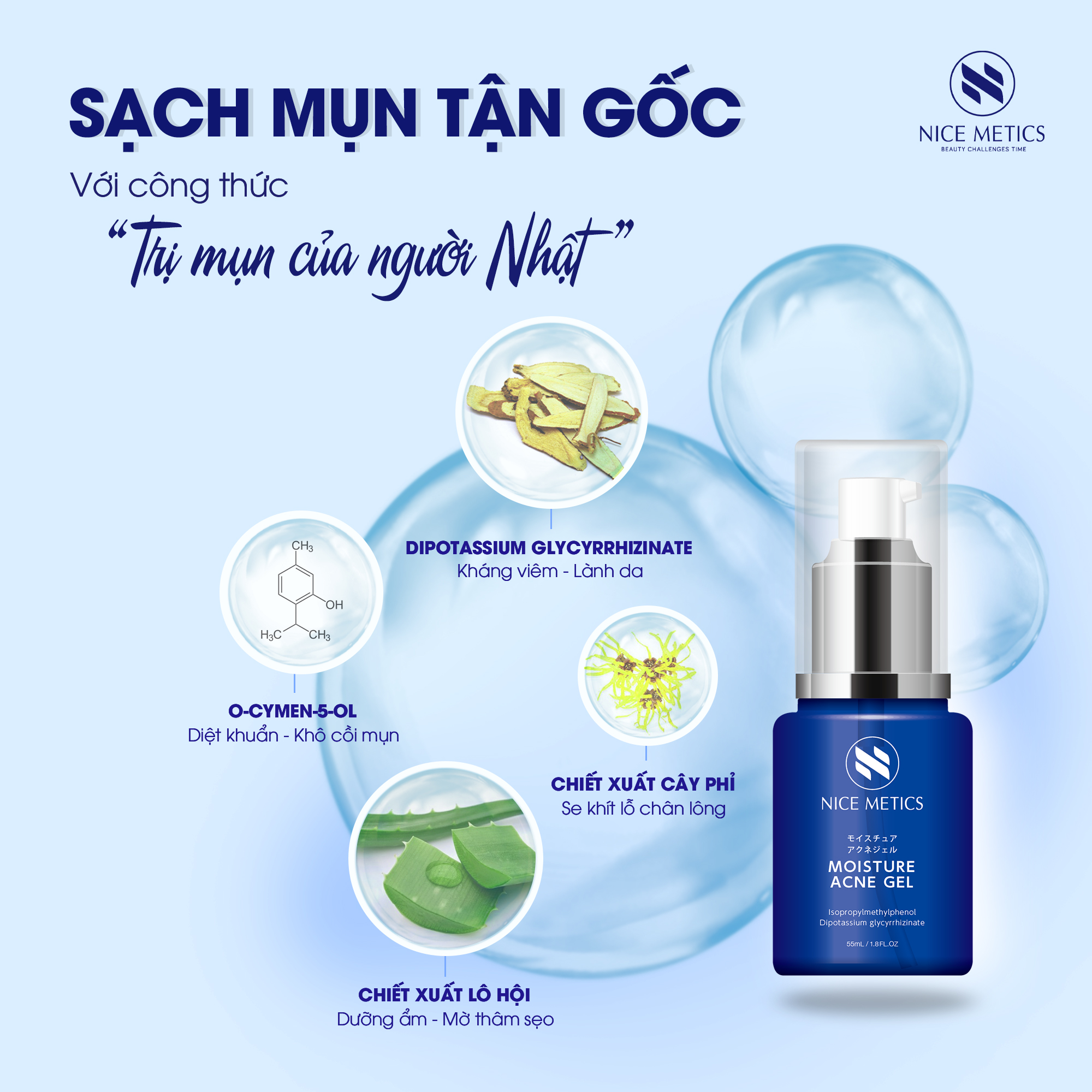 Gel trị mụn Nice Metics Moisture Acne Gel giúp trị mụn, kháng viêm, dưỡng ẩm da và làm se khít lỗ chân lông, phục hồi làn da sau mụn. Cho làn da sạch mụn sáng mịn.