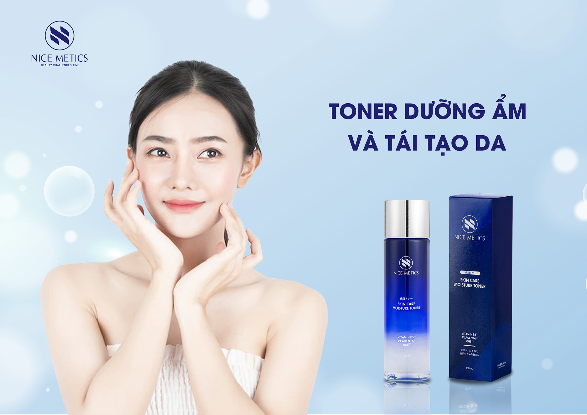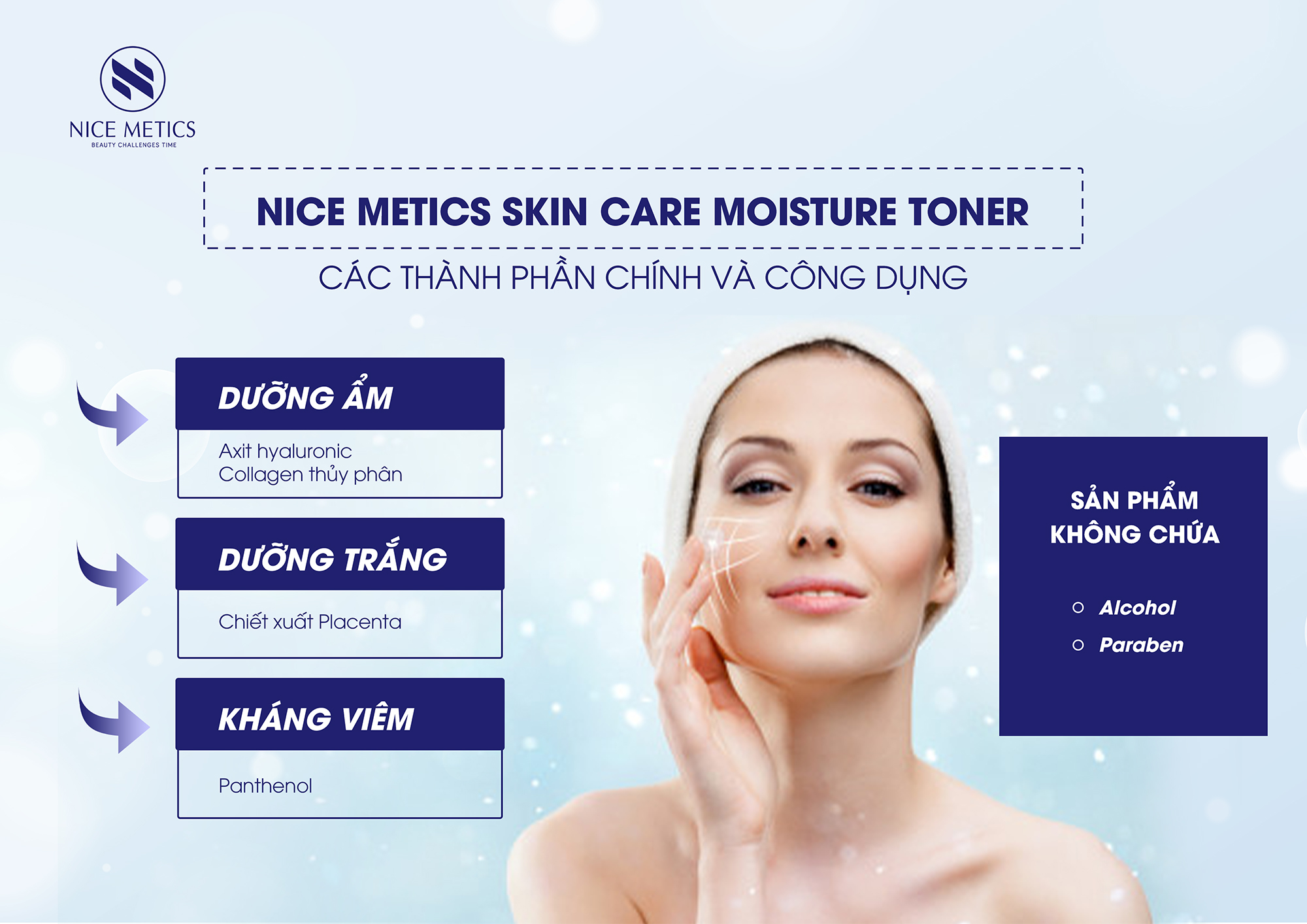 Toner dưỡng ẩm, chăm sóc da NICE METICS có chứa thành phần dưỡng ẩm vượt trội là Axit hyaluronic và Collagen thủy phân, cùng với thành phần làm trắng da chiết xuất từ nhau thai cừu và vitamin B5 có tác dụng chống viêm, làm se khít lỗ chân lông.