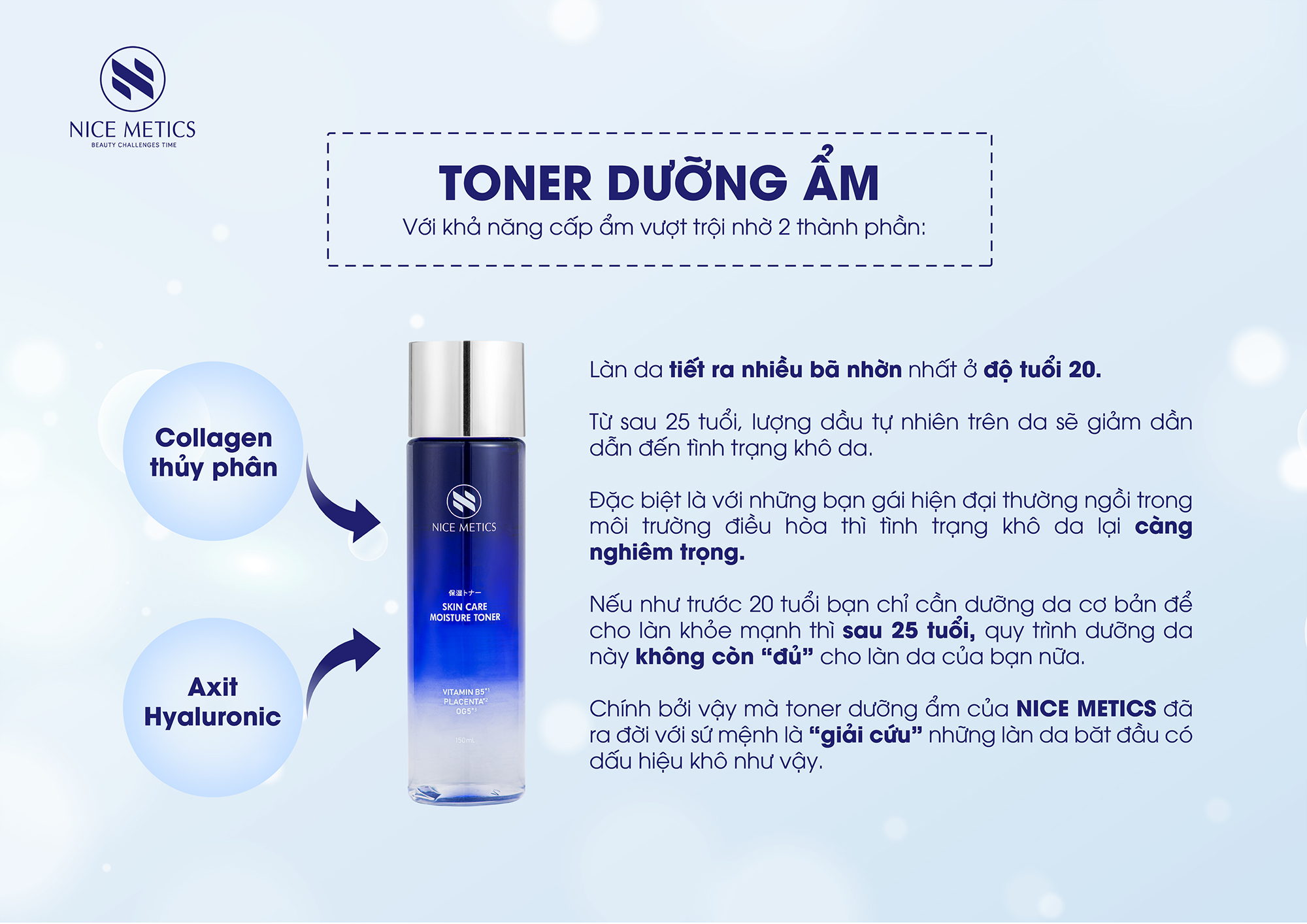 Chính vì vậy mà toner dưỡng ẩm của Nice Metics đã được nghiên cứu và sản xuất để "giải cứu" những làn da bắt đầu có dấu hiệu khô da như vậy.